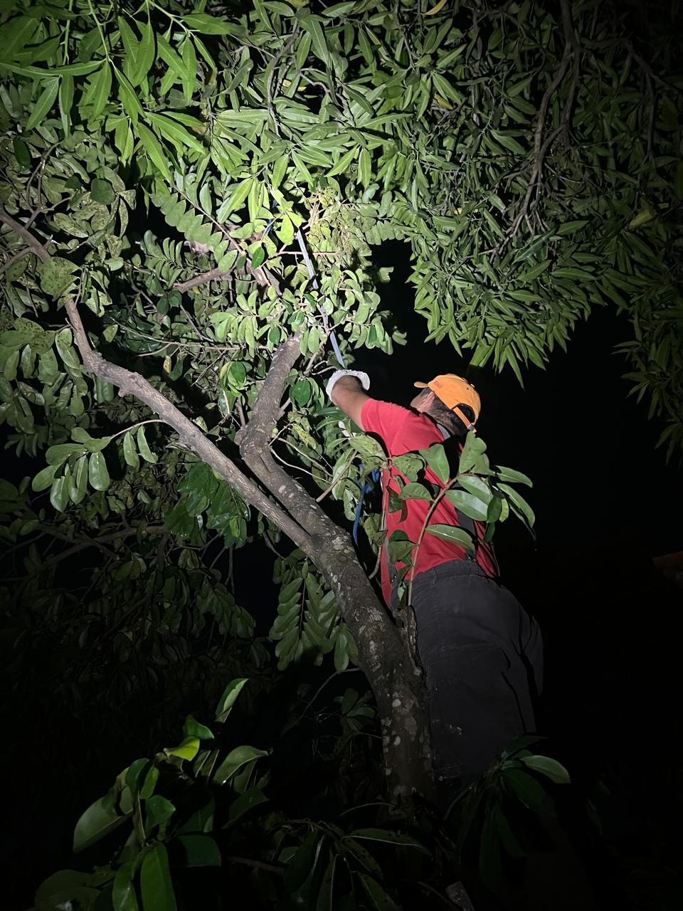 Ao chegar, a equipe encontrou o gatinho assustado no alto da árvore. Com um cambão e uma escada, os bombeiros realizaram o resgate com sucesso.